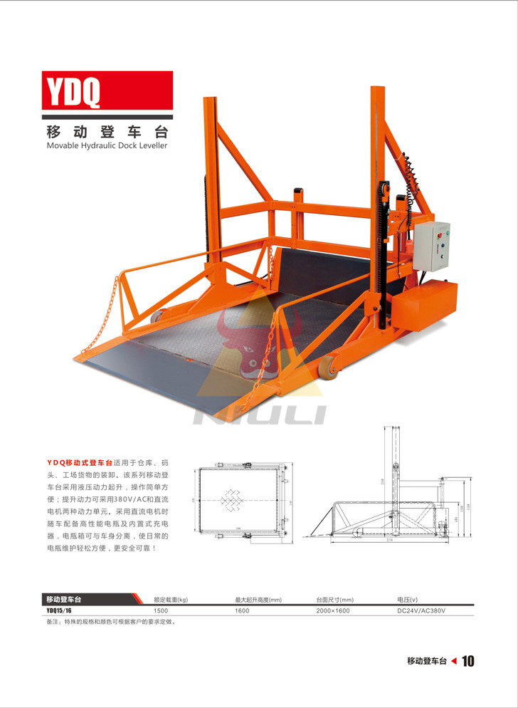 YDQ移動(dòng)式登車(chē)臺(tái)適用于倉(cāng)庫(kù)、碼頭、工場(chǎng)貨物的裝卸。該系列移動(dòng)登車(chē)臺(tái)采用液壓動(dòng)力起升,操作簡(jiǎn)單方便;提升動(dòng)力可采用380V/AC和直流電機(jī)兩種動(dòng)力單元。采用直流電機(jī)時(shí)隨車(chē)配備高性能電瓶及內(nèi)置式充電器。