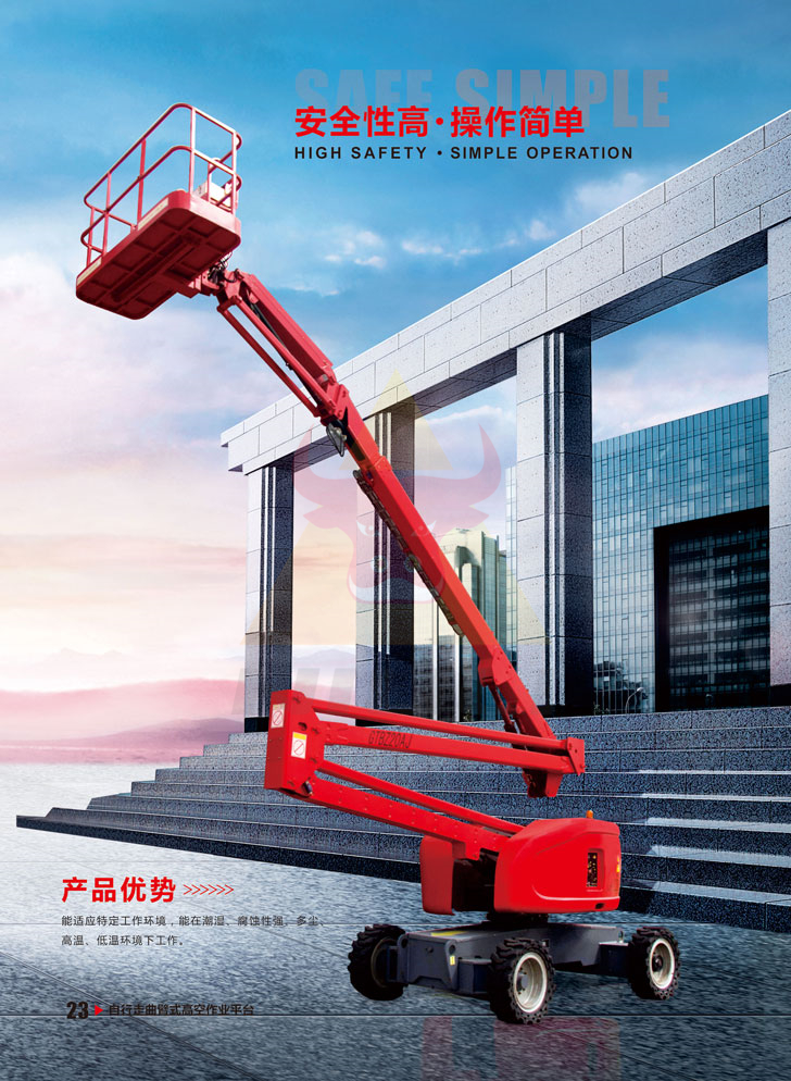曲臂式高空作業(yè)平臺具有伸縮臂,能懸伸作業(yè),跨越一定的障礙或在一處升降可進行多點作業(yè);升降平臺移動性好,轉(zhuǎn)移場地方便;外觀美觀,適于室內(nèi)外作業(yè)和存放。