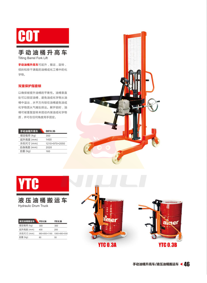 手動油桶升高車可起升,搬運,旋轉(zhuǎn),傾斜和排干滿載的油桶或化工桶中的化學(xué)物。雙重保護指套鎖以確保被提升油桶的平衡性。油桶垂直處可以鎖定油桶,避免油或化學(xué)物質(zhì)從油桶中溢出。